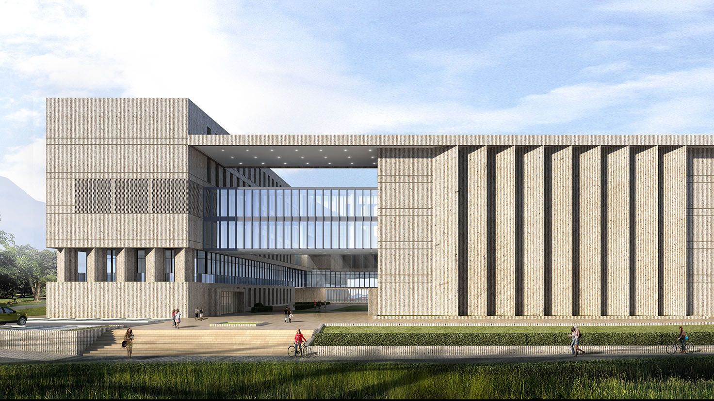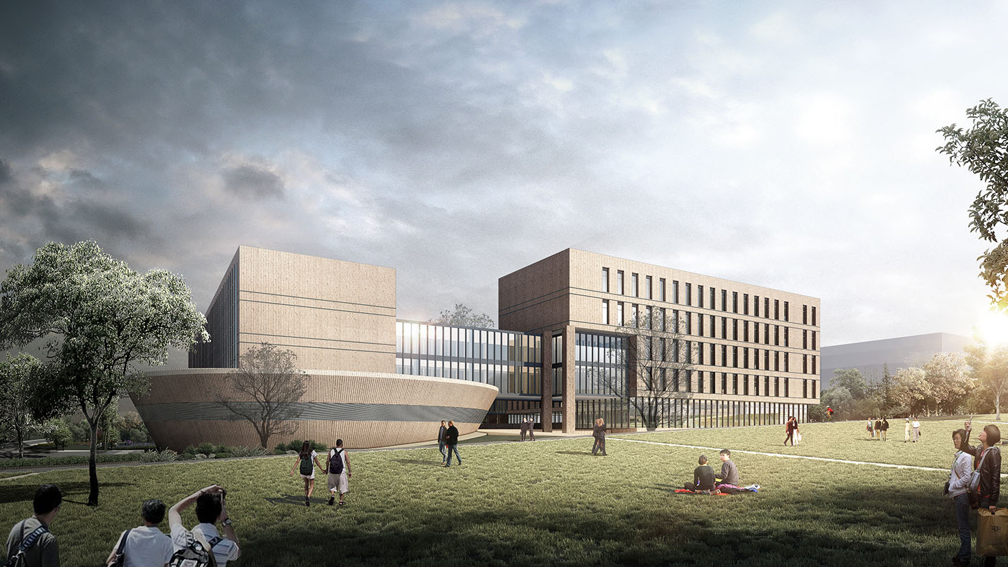 設(shè)計(jì)背景:本案遵循基地現(xiàn)有特性,合理利用原有地形高差進(jìn)行設(shè)計(jì),將南、北兩棟在高度上形成“北高南低”之勢(shì)以呼應(yīng)地形的特性。充分利用臺(tái)階、坡道、連廊等灰空間將建筑空間融于自然環(huán)境中,使其建筑與自然環(huán)境共融,形成“山水校園”。 通過虛實(shí)穿插的庭院空間營(yíng)造不同的空間關(guān)系,整體形成一種“既圍合又開放”的空間布局。這種空間布局既體現(xiàn)了學(xué)校各院系對(duì)內(nèi)研究的嚴(yán)謹(jǐn)性,同時(shí)又利用開放空間滿足各院系之間交流與學(xué)習(xí)的需要。這種“既圍合又開放”的空間布局同時(shí)映襯著毛澤東同志虛懷若谷、海納百川的氣魄,體現(xiàn)的是一種各院系之間的團(tuán)結(jié)精神。"